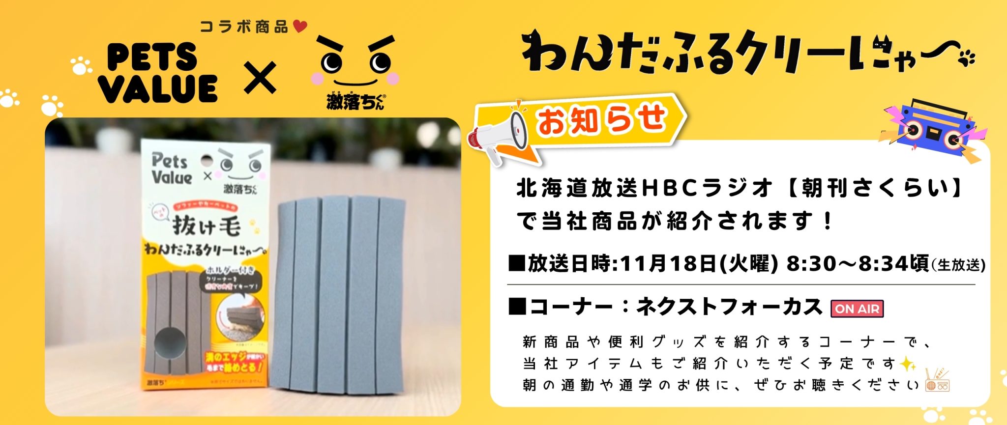2025年11月18日(火)、北海道放送株式会社(HBCラジオ)で放送される「朝刊さくらい」のコーナー「ネクストフォーカス」にて、当社グループ会社 ペッツバリュー株式会社 の「わんだふるクリーにゃー」が紹介されます。