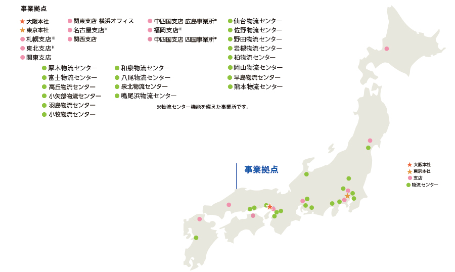 | 八尾物流センター | 〒581-0072 大阪府八尾市久宝寺6丁目7-19 TEL:072-996-7400 FAX:072-996-7444 |